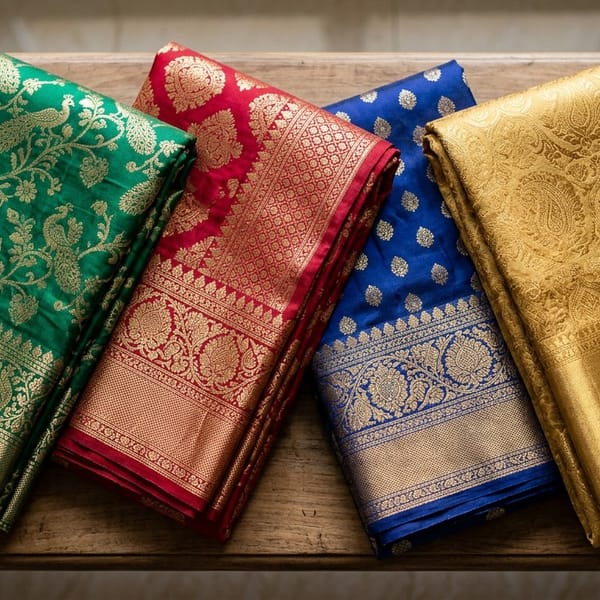 Our master artisans work with the finest Tussar silk, spending weeks on a single saree, interlacing gold and silver zari to create patterns inspired by Mughal architecture, temple carvings, and the natural world. Every piece is a collaboration between human hands and living tradition.
